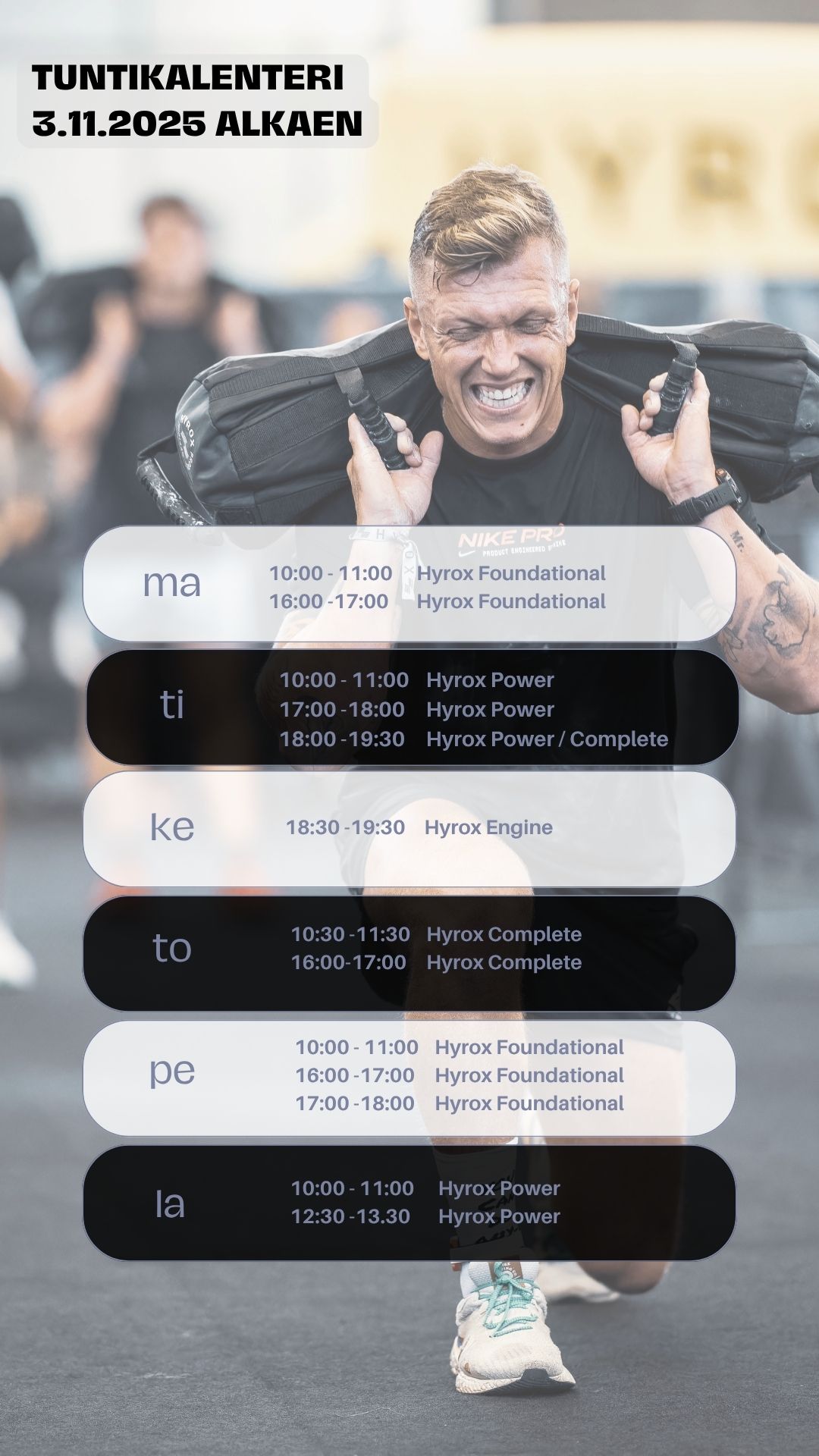 Meillä on tarjolla Hyrox-treenejä kuutena päivänä viikossa.